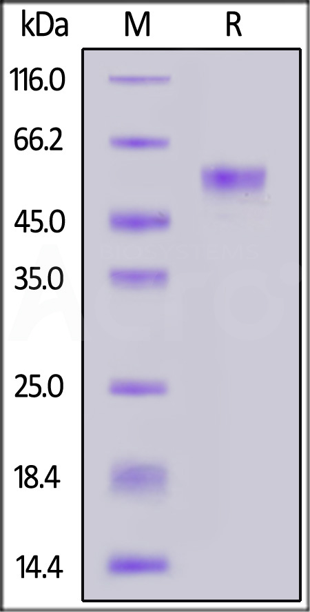 Molecular Mass : | The protein has a calculated MW of 47.1 kDa. The protein migrates as 50-60 kDa under reducing (R) condition (SDS-PAGE) due to glycosylation. |