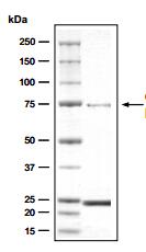 | Product Overview : | Human FLT3, C-terminal fragment, amino acids R571-S993 (as in NCBI/Protein entry NP_004110.2), internal tandem duplication(oncological mutation: ITD) of aa 591-600 N-terminal GST-HIS6 fusion protein with a 3C cleavage site, was expressed in Sf9 insect cells |