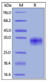 | Molecular Mass : | The protein has a calculated MW of 26.5 kDa. The protein migrates as 30-35 kDa under reducing (R) condition (SDS-PAGE) due to N-linked glycosylation which has been verified by PNGase F digestion. |