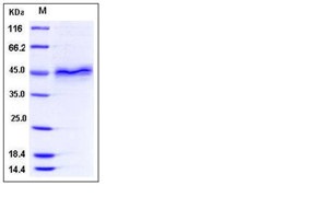 The secreted recombinant human FST (FS288) consists of 299 amino acids and has a predicted molecular mass of 33 kDa. As a result of glycosylation, rhFST (FS288) migrates as an approximately 45 kDa band in SDS-PAGE under reducing conditions. |