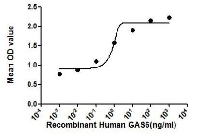 Growth arrest-specific 6, also known as GAS6, is a gamma-carboxyglutamic acid (Gla) domain-containing protein thought to be involved in the stimulation of cell proliferation. It has been reported that both PC-3 and DU 145 human prostate cancer cell lines are stimulated to proliferate by Gas6, however, this proliferative response strictly correlates with the expression of the Axl receptor, being higher in DU 145 cells. To test the proliferative effect of Gas6, DU 145 cells were seeded into triplicate wells of 96-well plates at a density of 2,000 cells/well and allowed to attach overnight, then the medium was replaced with serum-free standard DMEM prior to the addition of various concentrations of GAS6. After incubated for 72h, cells were observed by inverted microscope and cell proliferation was measure by Cell Counting Kit-8 (CCK-8). Briefly, 10μL of CCK-8 solution was added to each well of the plate, then measure the absorbance at 450nm using a microplate reader after incubating the plate for 1-4 hours at 37°C. |