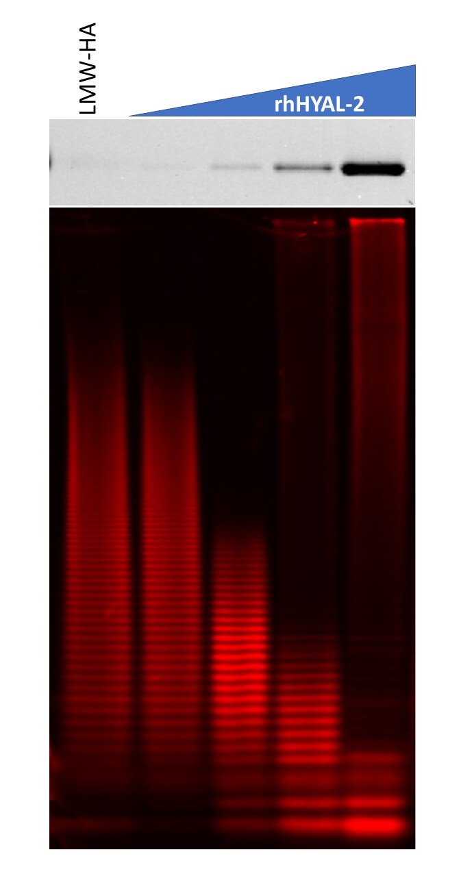 | Bio-activity : | Measured by its ability to digest Cy5-Labeled Hyaluronan (Low MW) to dp1-dp4. The majority of Cy5-Labeled Hyaluronan (Low MW) (2 pmol) is digested by 0.25 μg of Recombinant Human HYAL-2, as measured under the described conditions. |