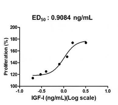 | Bio-activity : | Measure by its ability to induce MCF-7 cells proliferation. The ED50 for this effect is 0.9-3.1 ng/mL. The specific activity of recombinant human IGF-I is approximately >1.2 × 10³ IU/mg. |