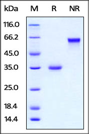 Molecular Mass : | The protein has a calculated MW of 28.8 kDa. As a result of glycosylation, the protein migrates as 36 kDa under reducing (R) condition, and 60-66 kDa under non-reducing (NR) condition (SDS-PAGE). |