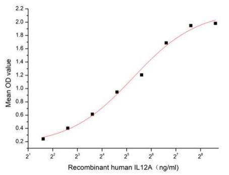 | Bio-activity : | human IL12A is a subunit of interleukin 12, a cytokine that acts on T and natural killer cells, and has a broad array of biological activities. Interleukin 12 is a disulfide-linked heterodimer composed of the 40 kD cytokine receptor like subunit encoded by this gene, and a 35 kD subunit encoded by IL12A. This cytokine is expressed by activated macrophages that serve as an essential inducer of Th1 cells development. Interleukin 12A can combind with Epstein Barr Virus Induced Protein 3 (EBI3). Thus a functional binding ELISA assay was conducted to detect the interaction of recombinant human IL12A and recombinant human EBI3. Briefly, IL12A were diluted serially in PBS, with 0.01% BSA (pH 7.4). Duplicate samples of 100 µl were then transferred to EBI3-coated microtiter wells and incubated for 2h at 37°C. Wells were washed with PBST and incubated for 1h with anti-IL12A pAb, then aspirated and washed 3 times. After incubation with HRP labelled secondary antibody, wells were aspirated and washed 3 times. With the addition of substrate solution, wells were incubated 15-25 minutes at 37°C. Finally, add 50 µL stop solution to the wells and read at 450 nm immediately. The binding activity of recombinant human IL12A and recombinant human EBI3 was shown, the EC50 for this effect is 38.3 ng/mL. |