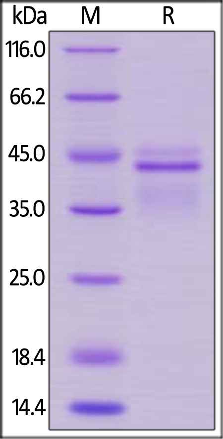 | Product Overview : | Recombinant Human IL12B & IL12A Protein, His & Flag-tagged is expressed from human 293 cells (HEK293). It contains AA Ile 23 - Ser 328 (IL-12B) and Arg 23 - Ser 219 (IL-12A) (Accession # P29460-1 (IL12B) and P29459-1 (IL12A)). Predicted N-terminus: Ile 23 (IL12B) and Arg 23 (IL12A). Human IL-12B & IL-12A Heterodimer Protein is produced by co-expression of IL-12B and IL-12A, has a calculated MW of 36.6 kDa (IL-12B) and 23.8 kDa (IL-12A). Subunit IL-12B is fused with polyhistidine tag at the C-terminus and subunit IL-12A is fused with flag tag at the C-terminus. The predicted N-terminus is Ile 23 (IL12B) and Arg 23 (IL12A). The reducing (R) heterodimer protein migrates as 43 kDa and 45 kDa (IL12B) and 35-40 kDa (IL12A) respectively due to glyosylation. |