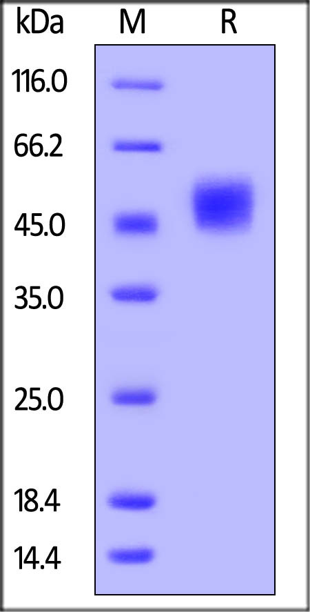This protein carries a human IgG1 Fc tag at the N-terminus. The protein has a calculated MW of 40.2 kDa. The protein migrates as 45-60 kDa under reducing (R) condition (SDS-PAGE) due to glycosylation. |