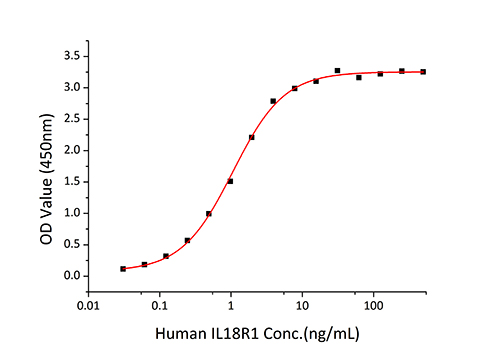 | Bio-activity : | Measured by its binding ability in a functional ELISA.Immobilized IL18R1 Mouse mAb at 1ug/mL (100 μL/well) can bind Human IL18R1 with a linear range of 0.03-1.06ng/ml. |