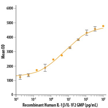 | Bio-activity : | Measured in a cell proliferation assay using D10.G4.1 mouse helper T cells. The ED50 for this effect is <12 pg/mL. The specific activity of recombinant human IL-1 beta is >5.0 x 107 IU/mg, which is calibrated against the human IL-1 beta WHO International Standard. |