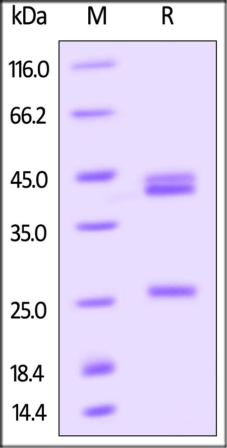 Biotinylated Human IL23A & IL12B Heterodimer Protein, produced by co-expression of IL23A and IL12B, has a calculated MW of 21.9 kDa (IL23A) & 34.7 kDa (IL12B). Subunit IL23A is fused with a polyhistidine tag at the N-terminus and subunit IL12B contains no tag. The protein has a calculated MW of 21.9 kDa (IL23A) & 34.7 kDa (IL12B). The protein migrates as 26 kDa (IL23A) & 40-45 kDa (IL12B) under reducing (R) condition (SDS-PAGE) due to glycosylation. |