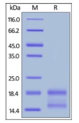 Molecular Mass : | The protein has a calculated MW of 15.0 kDa. The protein migrates as 15 kDa and 19 kDa under reducing (R) condition (SDS-PAGE) due to glycosylation. |