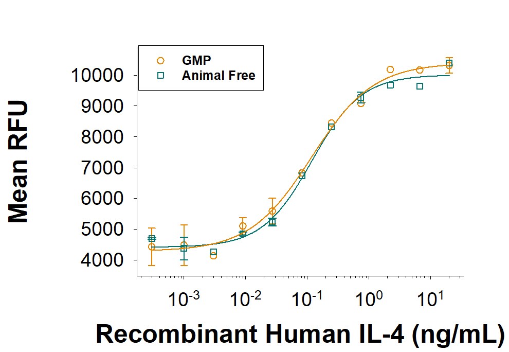 | Product Overview : | GMP recombinant human IL-4 protein (His25-Ser153) with an N-terminal Met was expressed in E. coli, produced in an Animal-Free laboratory and manufactured and tested under cGMP guidelines. |