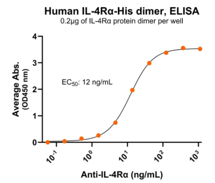 | Description : | Human interleukin 4 receptor alpha (IL-4Rα) is a Type I transmembrane and a Type I cytokine receptor. IL-4Rα is also known as cluster of differentiation 124 (CD124). IL-4Rα is a key component in interleukin 4 (IL-4) and IL-13 cytokine signaling involved in immune regulation, particularly in Th2 immune responses, allergy, and asthma. IL-4Rα contains an extracellular domain with an overall L shape organized in two covalently linked domains: an h-type immunoglobulin fold (D1) and a standard fibronectin type III (FN III)–like topology (D2). IL-4Rα can bind IL-4 and IL-13 and allergic inflammation is largely driven by IL-4 and IL-13 signaling through IL-4Rα, making IL-4Rα a promising therapeutic target for allergic diseases. |