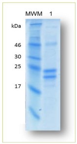 The protein was resolved by SDS polyacrylamide gel electrophoresis and the gel was stained with coomassie blue. |