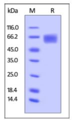 This protein carries a polyhistidine tag at the C-terminus.The protein has a calculated MW of 39.4 kDa. The protein migrates as 55-75 kDa under reducing (R) condition (SDS-PAGE) due to glycosylation. |