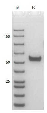 Molecular Mass : | The protein has a calculated MW of 43kDa.The reducing (R) heterodimer protein migrates as 50-70 kDa due to glycosylation |