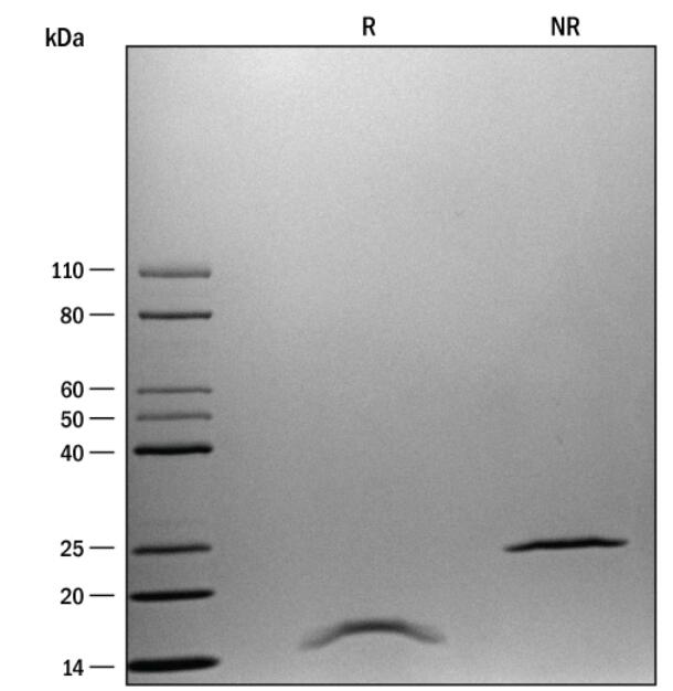 | Molecular Mass : | Predicted Molecular Mass:13 kDa (monomer) SDS-PAGE: 14 kDa, reducing conditions, 24 kDa, non-reducing conditions |