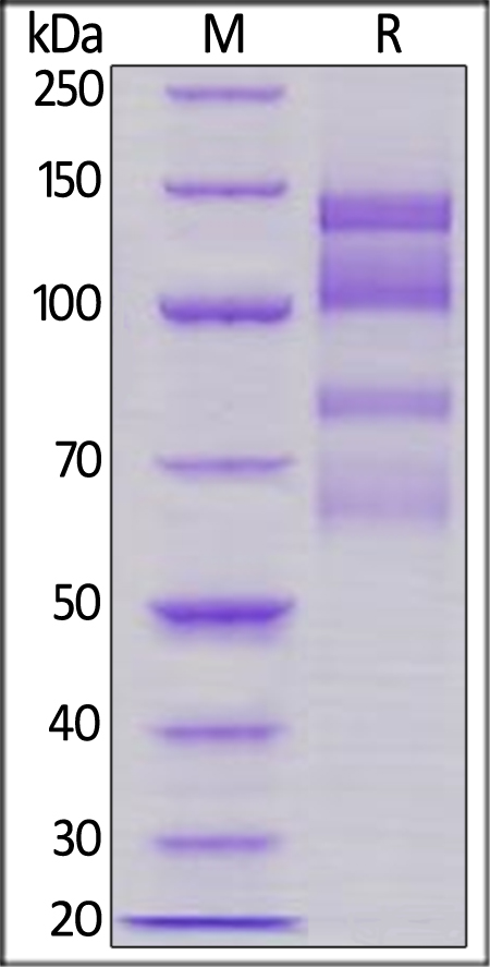 | Product Overview : | Recombinant Human ITGA4 & ITGB1 Heterodimer Protein, His-tagged is expressed from human 293 cells (HEK293). It contains AA Tyr 34 - Thr 977 (ITGA4) & Gln 21 - Asp 728 (ITGB1) (Accession # P13612-1 (ITGA4) & P05556-1 (ITGB1)). Predicted N-terminus: Tyr 34 (ITGA4) & Gln 21 (ITGB1). Human ITGA4 & ITGB1 Heterodimer Protein, produced by co-expression of ITGA4 and ITGB1, has a calculated MW of 111.4 kDa (ITGA4) & 83.7 kDa (ITGB1). Subunit ITGA4 is fused with an acidic tail at the C-terminus and followed by a polyhistidine tag and subunit ITGB1 contains no tag but a basic tail at the C-terminus. The predicted N-terminus is Tyr 34 (ITGA4) & Gln 21 (ITGB1). The reducing (R) protein migrates as 60-70 kDa and 80-85 kDa (ITGA4) and 100-133 kDa and 135-150 kDa (ITGB1) respectively due to glycosylation. |