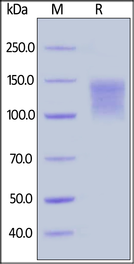 Product Overview : | Recombinant Human ITGA5 & ITGB1 Heterodimer Protein, His-tagged is expressed from human 293 cells (HEK293). It contains AA Phe 42 - Tyr 995 (ITGA5) & Gln 21 - Asp 728 (ITGB1) (Accession # P08648-1 (ITGA5) & P05556-1 (ITGB1)). Predicted N-terminus: Phe 42 (ITGA5) & Gln 21 (ITGB1). Human ITGA5 & ITGB1 Heterodimer Protein, produced by co-expression of ITGA5 and ITGB1, has a calculated MW of 104.1 kDa (ITGA5) and 83.7 kDa (ITGB1). Subunit ITGA5 is fused with an acidic tail at the C-terminus and followed by a polyhistidine tag and subunit ITGB1 contains no tag but a basic tail at the C-terminus. The reducing (R) protein migrates as 117-150 kDa (ITGA5) and 100-116 kDa (ITGB1) respectively due to glycosylation. |