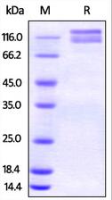 Human ITGAV&ITGB6 Heterodimer Protein, His Tag&Tag Free, produced by co-expression of ITGAV and ITGB6, has a calculated MW of 112.9 kDa (ITGAV) and 79.6 kDa (ITGB6). Subunit ITGAV is fused with an acidic tail at the C-terminus and followed by a polyhistidine tag and subunit ITGB6 contains no tag but a basic tail at the C-terminus. The non-reducing (NR) protein migrates as 80-90 kDa (ITGB6) and 130-150 kDa (ITGAV) respectively due to glycosylation. |
