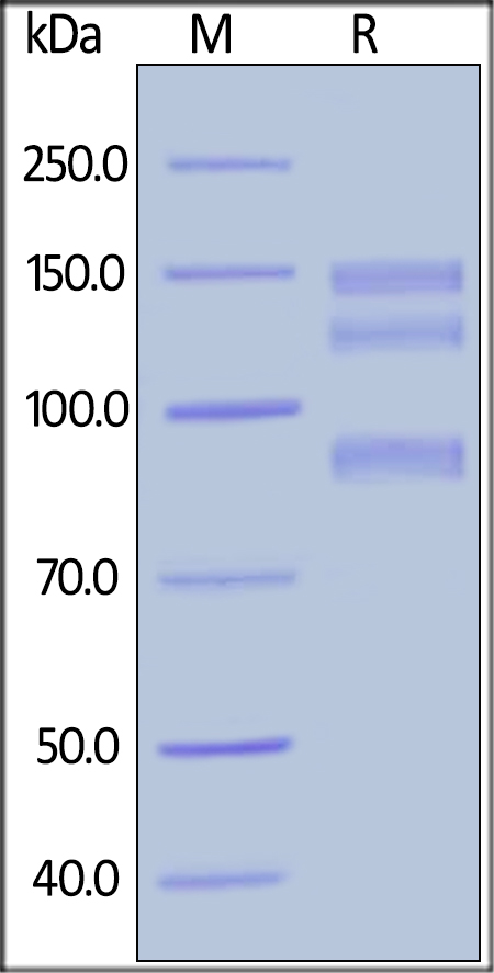 | Product Overview : | Recombinant Human ITGAV & ITGB8 Heterodimer Protein, His-tagged is expressed from human 293 cells (HEK293). It contains AA Phe 31 - Val 992 (ITGAV) & Glu 43 - Arg 684 (ITGB8) (Accession # NP_002201 (ITGAV) & NP_002205 (ITGB8)). Predicted N-terminus: Phe 31 (ITGAV) & Glu 43 (ITGB8). Human ITGAV & ITGB8 Heterodimer Protein, produced by co-expression of ITGAV and ITGB8, has a calculated MW of 113.0 kDa (ITGAV) and 76.5 kDa (ITGB8). Subunit ITGAV is fused with polyhistidine tag at the C-terminus and followed by a acidic tail and subunit ITGB8 contains no tag but a basic tail at the C-terminus. The reducing (R) protein migrates as 120-130 kDa and 140-150 kDa (ITGAV) and 90-95 kDa (ITGB8) respectively due to glycosylation. |