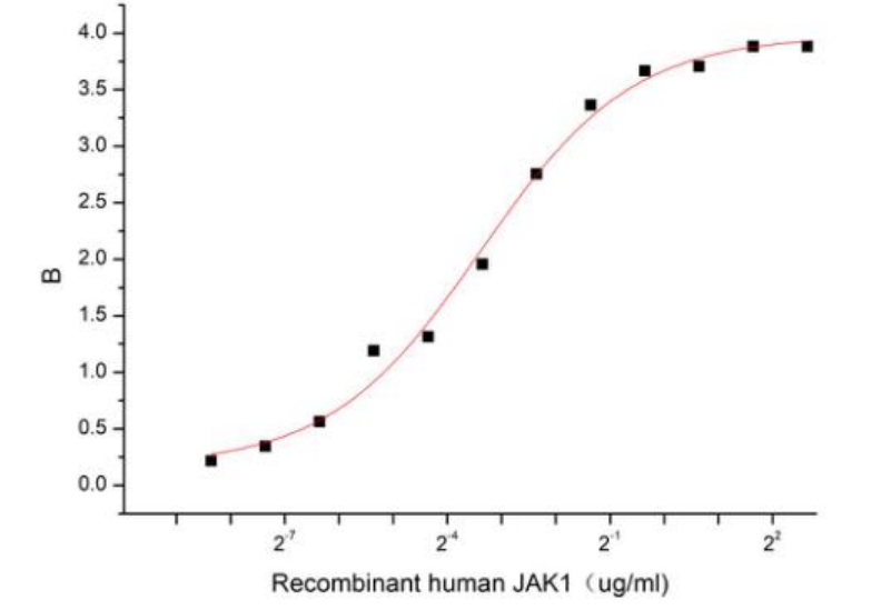 | Bio-activity : | Janus Kinase 1, also known as JAK1, is a member of the Janus kinase family, which plays a crucial role in various cellular processes, including signal transduction, immune response, and hematopoiesis. It is reported that the binding of JAK1 to IFNa2 plays an important role in immune response and antiviral defense. Thus a functional binding ELISA assay was conducted to detect the interaction of recombinant human JAK1 and recombinant mouse IFNa2. Briefly, JAK1 was diluted serially in PBS with 0.01% BSA (pH 7.4). Duplicate samples of 100 μl were then transferred to IFNa2-coated microtiter wells and incubated for 1h at 37°C. Wells were washed with PBST and incubated for 1h with anti-JAK1 pAb, then aspirated and washed 3 times. After incubation with HRP labelled secondary antibody for 1h at 37°C, wells were aspirated and washed 5 times. With the addition of substrate solution, wells were incubated 15-25 minutes at 37°C. Finally, add 50 µL stop solution to the wells and read at 450/630 nm immediately. The binding activity of recombinant human JAK1 and recombinant mouse IFNa2 was shown in Figure, the EC50 for this effect is 0.1 ug/mL. |