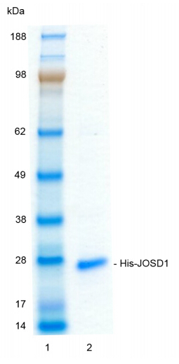 Deubiquitylase Enzyme Assay: The activity of His-JOSD1 was validated by determining the increase in fluorescence measured as a result of the enzyme catalysed cleavage of the fluorogenic substrate Ubiquitin-Rhodamine110-Glycine generating Ubiquitin and Rhodamine110-Glycine. Incubation of the substrate in the presence or absence of His-JOSD1 was compared confirming the deubiquitylating activity of His-JOSD1. |