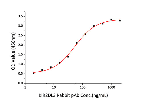 | Bio-activity : | Measured by its binding ability in a functional ELISA.Immobilized Human KIR2DL3 at 1 μg/mL (100 μL/well) can bind KIR2DL3 Rabbit pAb with a linear range of 2-54 ng/mL. |