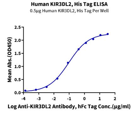 | Bio-activity : | Immobilized Human KIR3DL2, His Tag at 5μg/ml (100μl/well) on the plate. Dose response curve for Anti-KIR3DL2 Antibody, hFc Tag with the EC50 of 0.11μg/ml determined by ELISA. |