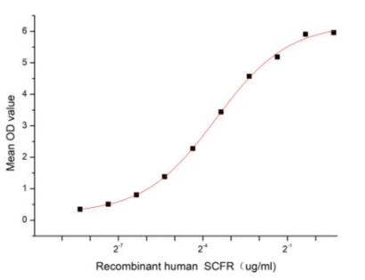 | Bio-activity : | Stem Cell Factor Receptor (SCFR), also known as c-Kit and CD117, is a widely expressed 145 kDa receptor tyrosine kinase. Binding of SCF R to SCF promotes the survival, differentiation, and mobilization of progenitor cells in multiple lineages. Mature human SCFR consists of a 499 amino acid (aa) extracellular domain (ECD) with five tandem immunoglobulin-like domains, a 21 aa transmembrane segment, and a 431 aa cytoplasmic domain with the split tyrosine kinase domain. SCFR is up-regulated on dendritic cells by Th2- or Th17-biasing stimuli, and it is required for subsequent dendritic cell induction of Th2 and Th17 responses. Besides, Epidermal Growth Factor (EGF) has been identified as an interactor of SCFR, thus a functional binding ELISA assay was conducted to detect the interaction of recombinant human SCFR and recombinant rat EGF. Briefly, biotin-linked SCFR were diluted serially in PBS, with 0.01% BSA (pH 7.4). Duplicate samples of 100 ul were then transferred to EGF-coated microtiter wells and incubated for 1h at 37°C. Wells were washed with PBST 3 times and incubation with Streptavidin-HRP for 30min, then wells were aspirated and washed 5 times. With the addition of substrate solution, wells were incubated 15-25 minutes at 37°C. Finally, add 50 µl stop solution to the wells and read at 450 nm immediately. The binding activity of recombinant human SCFR and recombinant rat EGF was shown, the EC50 for this effect is 0.09 ug/mL. |