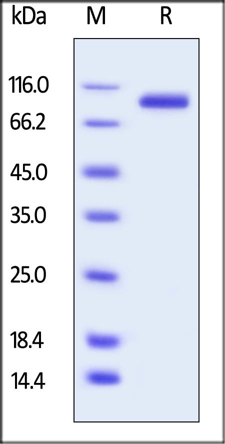 | Molecular Mass : | The protein has a calculated MW of 73.3 kDa. The protein migrates as 90-100 kDa under reducing (R) condition (SDS-PAGE) due to glycosylation. |