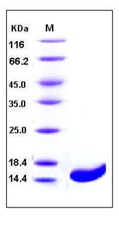 Molecular Mass : | This protein carries no "tag".The protein has a calculated MW of 14.71 kDa. The protein migrates as 13-15 kDa under reducing (R) condition (SDS-PAGE). |