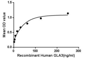 | Bio-activity : | Galectin 3 (GAL3) is a member of the lectin family, of which 14 mammalian galectins have been identified. It is also a member of the beta-galactoside-binding protein family that plays an important role in cell-cell adhesion, cell-matrix interactions, macrophage activation, angiogenesis, metastasis, apoptosis. The protein also has been demonstrated to be involved in cancer, inflammation and fibrosis, heart disease, and stroke. GAL3 is expressed in the nucleus, cytoplasm, mitochondrion, cell surface, and extracellular space. Besides, Alpha-2-Heremans Schmid Glycoprotein (aHSG) has been identified as an interactor of GAL3, thus a binding ELISA assay was conducted to detect the interaction of recombinant human GAL3 and recombinant human aHSG. Briefly, GAL3 were diluted serially in PBS, with 0.01% BSA (pH 7.4). Duplicate samples of 100uL were then transferred to aHSG-coated microtiter wells and incubated for 2h at 37°C. Wells were washed with PBST and incubated for 1h with anti-GAL3 pAb, then aspirated and washed 3 times. After incubation with HRP labelled secondary antibody, wells were aspirated and washed 3 times. With the addition of substrate solution, wells were incubated 15-25 minutes at 37°C. Finally, add 50µL stop solution to the wells and read at 450nm immediately. The binding activity of GAL3 and aHSG was shown, and this effect was in a dose dependent manner. |