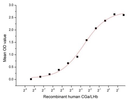 Luteinizing Hormone (LH) is a 42 kDa heterodimer belonging to the glycoprotein hormone family. It is composed of noncovalently linked glycosylated alpha and beta chains. The alpha subunit (CG alpha ) is also a component of Follicle-Stimulating Hormone (FSH), Thyroid-Stimulating Hormone, and Chorionic Gonadotropin. The unique beta subunit confers the protein’s specific biological action and is responsible for the interaction with its receptor. LH is produced and secreted by the anterior pituitary gland. Its secretion is controlled by Gonadotropin-Releasing Hormone from the hypothalamus; however, LH secretion can also be stimulated by estradiol. A functional binding ELISA assay was conducted to detect the interaction of recombinant human CGa/LHb and recombinant human Dopamine Receptor D1 (DRD1). Briefly, biotin-linked CGa/LHb were diluted serially in PBS, with 0.01% BSA (pH 7.4). Duplicate samples of 100 μl were then transferred to DRD1-coated microtiter wells and incubated for 1h at 37°C. Wells were washed with PBST 3 times and incubation with Streptavidin-HRP for 30min, then wells were aspirated and washed 5 times. With the addition of substrate solution, wells were incubated 15-25 minutes at 37°C. Finally, add 50 µl stop solution to the wells and read at 450 nm immediately. The binding activity of CGa/LHb and DRD1 was shown, the EC50 for this effect is 0.158 ug/mL. |