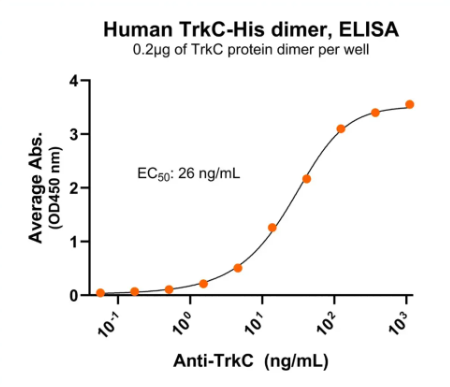 | Product Overview : | TrkC protein dimer contains the TrkC extracellular domain (UniProt# Q16288) fused with a proprietary cis-dimer motif followed by a His tag at the C-terminus was expressed in HEK293T. |