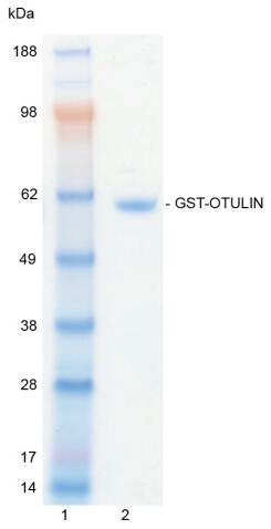 There are two main classes of DUB, cysteine proteases and metalloproteases. OTULIN is a cysteine protease and a member of the OTU (ovarian tumour) superfamily of proteins (Balakirev et al., 2003). Cloning of the human gene was first described by Ota et al. (2004). OTU enzymes play important roles as negative-feedback regulators in NF-kB signalling, interferon signalling and in p97 (cdc48)-mediated processes although the cellular functions of most OTU enzymes remain to be discovered. Ovarian tumour family DUBs contain a papain-like catalytic core of ~180 amino acids. |