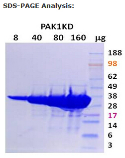 | Product Overview : | PAK1KD is a recombinant wild type human PAK1 kinase domain (amino acids 248–545 of full-length human PAK1) expressed in E. coli and purified to near homogeneity. PAK1KD does not have the inhibitory switch domain and has high specific activity. |