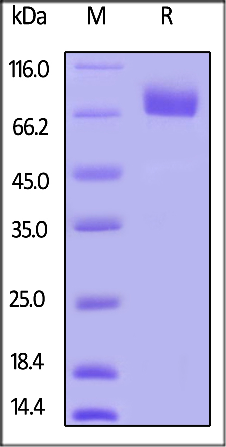 | Molecular Mass : | This protein carries a human IgG1 Fc tag at the C-terminus, followed by an Avi tag (Avitag).The protein has a calculated MW of 51.0 kDa. The protein migrates as 66-91 kDa under reducing (R) condition (SDS-PAGE) due to glycosylation. |
