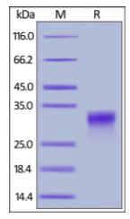 Molecular Mass : | The protein has a calculated MW of 18.2 kDa. The protein migrates as 28-33 kDa under reducing (R) condition (SDS-PAGE) due to glycosylation. |