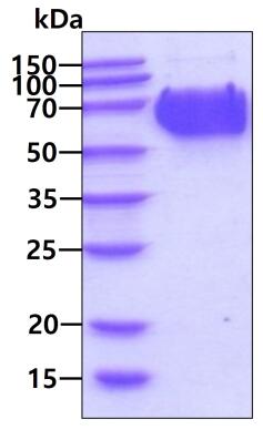 PRCP, also known as prolylcarboxypeptidase, is a member of the peptidase S28 family of serine exopeptidases. This protein is proteolytically processed to generate the mature lysosomal prolylcarboxypeptidase. This enzyme cleaves C-terminal amino acids linked to proline in peptides such as angiotension 2, 3 and des-Arg9 bradykinin. The cleavage occurs at acidic pH, but the enzyme activity is retained with some substrates at neutral pH. It has been shown to be an activator of the cell matrix-associated prekallikrein. The importance of angiotension 2, one of the substrates of this enzyme, in regulating blood pressure and electrolyte balance suggests that PRCP may be related to essential hypertension. Recombinant human PRCP, fused to His-tag at C-terminus, was expressed in HEK293 cell and purified by using conventional chromatography techniques. |