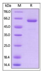 | Molecular Mass : | The protein has a calculated MW of 51.0 kDa. The protein migrates as 64 kDa under reducing (R) condition (SDS-PAGE) due to glycosylation. |