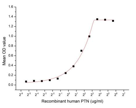 | Bio-activity : | Pleiotrophin (PTN) is a 136 amino acid secreted heparin-binding cytokine that signals diverse functions, including lineage-specific differentiation of glial progenitor cells, neurite outgrowth, and angiogenesis. A considerable amount of research has been carried out to understand the mechanisms by which PTN regulates these events. PTN has now been shown to bind a diverse collection of receptors including Syndecan 1 (SDC1). A functional binding ELISA assay was conducted to detect the interaction of recombinant human PTN and recombinant human SDC1. Briefly, PTN were diluted serially in PBS, with 0.01% BSA (pH 7.4). Duplicate samples of 100 μl were then transferred to SDC1-coated (2 ug/ml, 100 ul/well) microtiter wells and incubated for 1h at 37 °C. Wells were washed with PBST and incubated for 1h with PTN pAb, then aspirated and washed 3 times. After incubation with HRP labelled secondary antibody, wells were aspirated and washed 5 times. With the addition of substrate solution, wells were incubated 15-25 minutes at 37°C. Finally, add 50μL stop solution to the wells and read at 450nm immediately. The binding activity of recombinant human PTN and recombinant human SDC1 was shown in Figure 1, the EC50 was 3.47 ug/ml. |