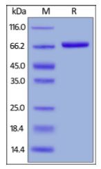 | Molecular Mass : | This protein carries a mouse IgG2a Fc tag at the C-terminusThe protein has a calculated MW of 62.4 kDa. The protein migrates as 65-80 kDa under reducing (R) condition (SDS-PAGE) due to glycosylation. |