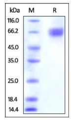 | Molecular Mass : | This protein carries a polyhistidine tag at the C-terminus.The protein has a calculated MW of 39.6 kDa. The protein migrates as 55-80 kDa under reducing (R) condition (SDS-PAGE) due to glycosylation. |