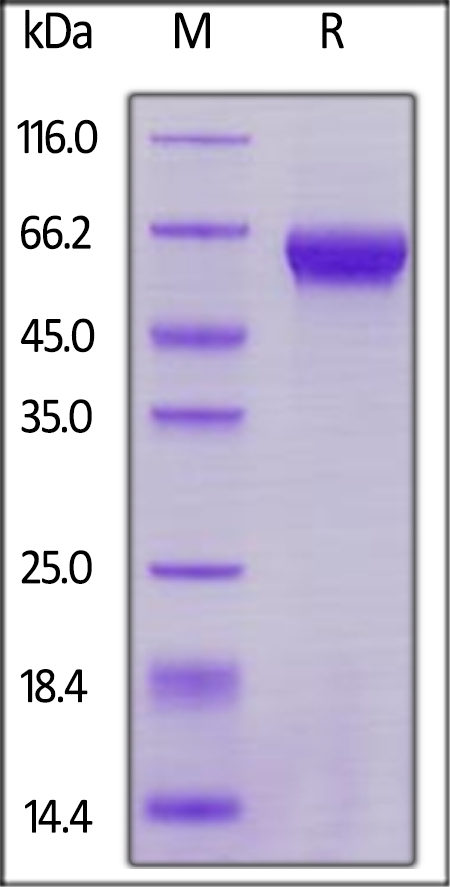 | Molecular Mass : | This protein carries an Avi tag (Avitag) at the C-terminusThe protein has a calculated MW of 45.2 kDa. The protein migrates as 55-66 kDa under reducing (R) condition (SDS-PAGE) due to glycosylation. |