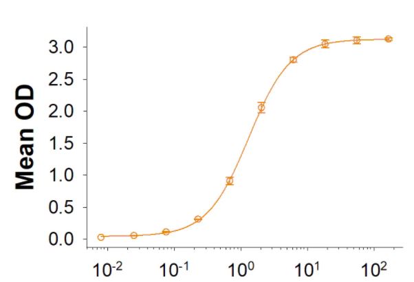 Measured by its binding ability in a functional ELISA. When Human ROR1 Antibody is immobilized at 0.5 µg/mL (100 µL/well), Biotinylated Recombinant Human ROR1 Fc Chimera Avi-tag binds with an ED50 of 0.6-3.6 ng/mL. |