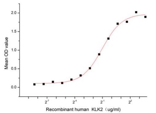 | Bio-activity : | Kallistatin (KAL), a member of serpin family, can Inhibit human amidolytic and kininogenase activities of tissue kallikrein. KAL is widely distributed in a variety of organs and body fluids and has biological effects such as anti-inflammatory, antioxidant stress, anti-angiogenesis and anti-tumor. Besides, Kallikrein 2 (KLK2) has been identified as an interactor of KAL, thus a functional binding ELISA assay was conducted to detect the interaction of recombinant human KAL and recombinant human KLK2. Briefly, KLK2 was diluted serially in PBS with 0.01% BSA (pH 7.4). Duplicate samples of 100 μl were then transferred to KAL-coated microtiter wells and incubated for 1h at 37°C. Wells were washed with PBST and incubated for 1h with anti-KLK2 pAb, then aspirated and washed 3 times. After incubation with HRP labelled secondary antibody for 1h at 37°C, wells were aspirated and washed 5 times. With the addition of substrate solution, wells were incubated 15-25 minutes at 37°C. Finally, add 50 µL stop solution to the wells and read at 450/630 nm immediately. When recombinant human KAL is immobilized at 2 ug/mL (100 uL/well), the concentration of KLK2 that produces 50% optimal binding response is found to be approximately 0.49 ug/mL. |