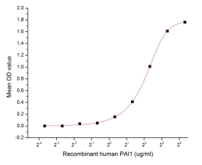 | Bio-activity : | Plasminogen Activator Inhibitor 1 (PAI1) is a member of the Serpin superfamily of serine protease inhibitors, Serpin E1/PAI 1 is the principal inhibitor of urokinase type plasminogen activator (uPA) and tissue type PA. As important regulators of extracellular matrix remodeling, uPA and PAI 1 play a major role in many processes such as angiogenesis, tumor invasion and obesity. Besides, Vitronectin (VTN) has been identified as an interactor of PAI1, thus a binding ELISA assay was conducted to detect the interaction of recombinant human PAI1 and recombinant human VTN. Briefly, PAI1 were diluted serially in PBS, with 0.01% BSA (pH 7.4). Duplicate samples of 100 µl were then transferred to VTN-coated microtiter wells and incubated for 2h at 37°C. Wells were washed with PBST and incubated for 1h with anti-PAI1 pAb, then aspirated and washed 3 times. After incubation with HRP labelled secondary antibody, wells were aspirated and washed 3 times. With the addition of substrate solution, wells were incubated 15-25 minutes at 37°C. Finally, add 50µL stop solution to the wells and read at 450nm immediately. The binding activity of PAI1 and VTN was shown, and this effect was in a dose dependent manner, the EC50 was approximately 4.47 ug/mL. |