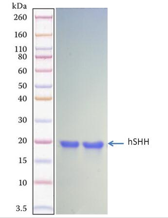 Sonic hedgehog (SHH) is used to study differentiation and expansion of human and mouse embryonic and adult stem cells. Studies suggest SHH is involved in regulating stem cell fates of neural and hematopoetic lineages1. It controls cell division of adult stem cells and has been implicated in development of some cancers2. SHH is instrumental in early embryo patterning and development. It has been implicated as the key inductive signal in patterning of the ventral neural tube, the anterior-posterior limb axis, and the ventral somites3. The mature biologically active form of SHH molecule is produced by autocatalytic cleavage of its precursor protein and corresponds to approximately the N-terminal half of the precursor molecule. Sonic Hedgehog is an approximately 20 kDa protein expressed in E. coli consisting of 175 amino acid residues. |