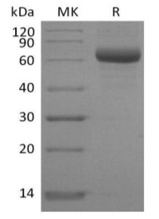 | Molecular Mass : | This protein carries a human IgG1 Fc tag at the C-terminus, followed by an Avi tag (Avitag).The protein has a calculated MW of 54.8 kDa. The protein migrates as 58 kDa under reducing (R) condition (SDS-PAGE) due to glycosylation. |